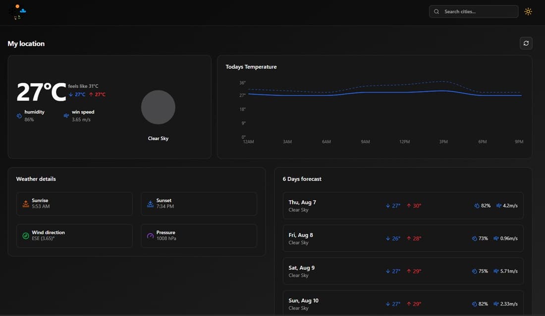 Weather App is a modern web application that provides real-time weather information for any location worldwide. Built with React and Next.js, it leverages the OpenWeatherMap API to fetch current weather forecasts, including temperature, humidity, wind speed, and more